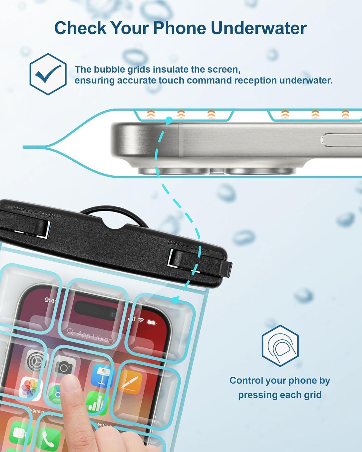 Underwater Photography – One side of the waterproof phone pouch features a bubbled grid arrangement, enabling sensitive touchscreen even at shallow depths; Perfect for sports underwater such as snorkelling, swimming, waterpark, beach