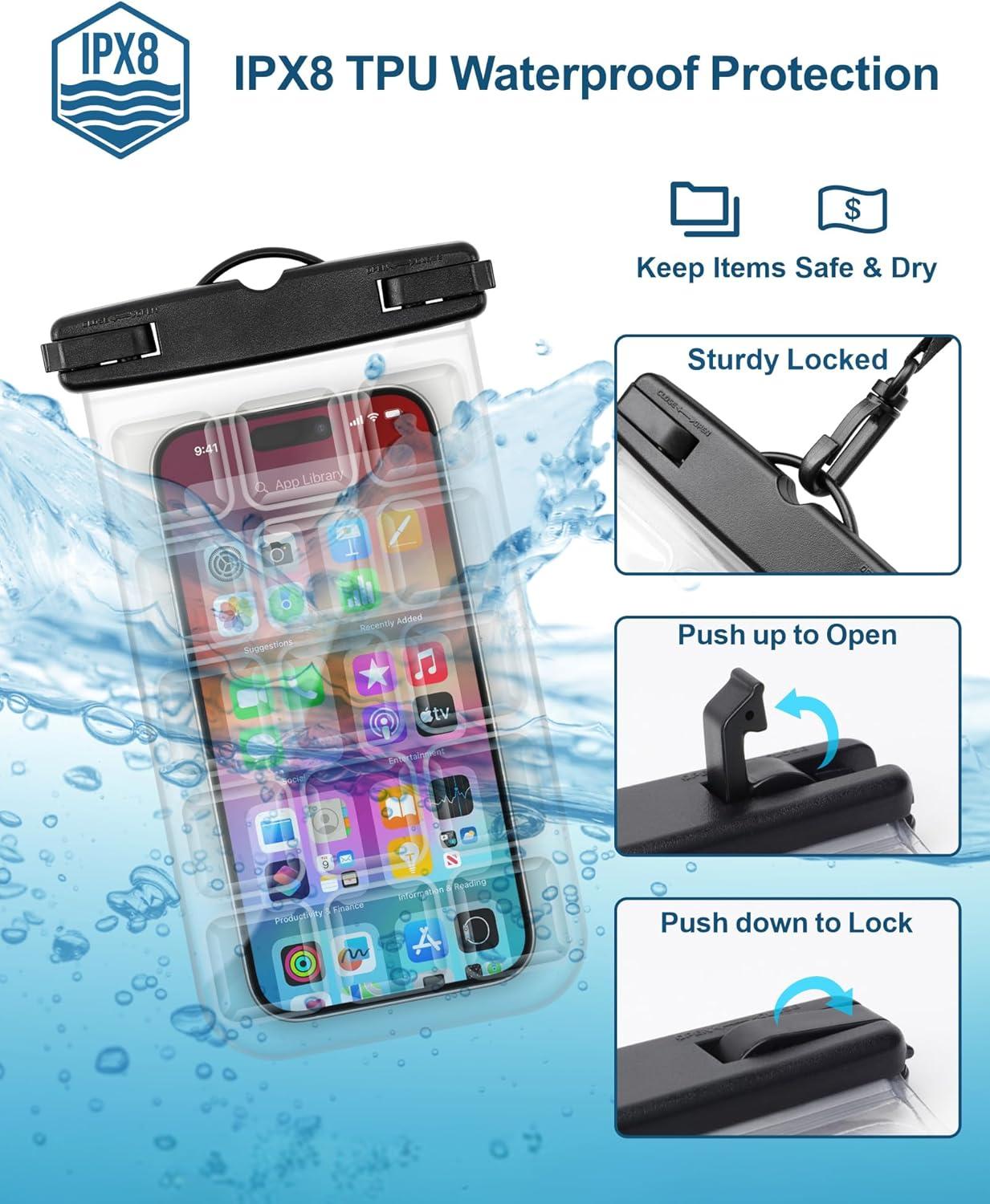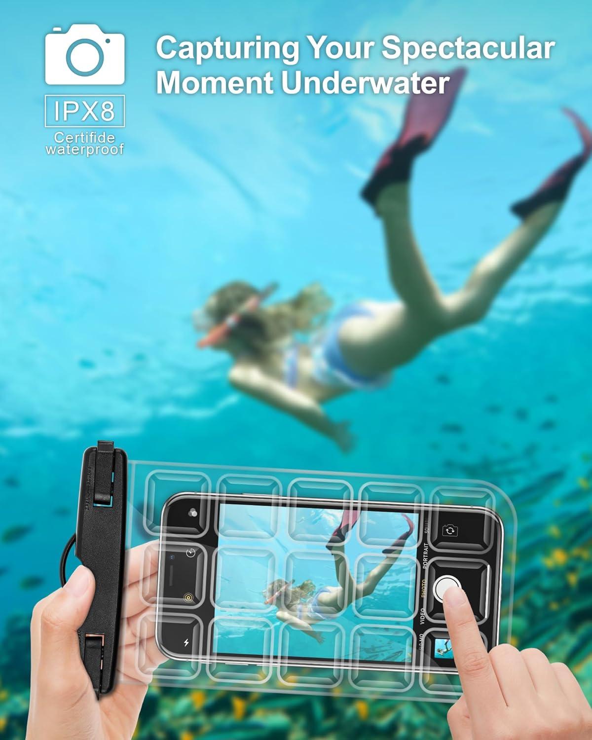 IPX8 Waterproof – The waterproof phone case is made of TPU material with integrated waterproofing, equipped with sturdy clips waterproof tested; Effectively keeping your phone dry from water, dust, sand, and snow